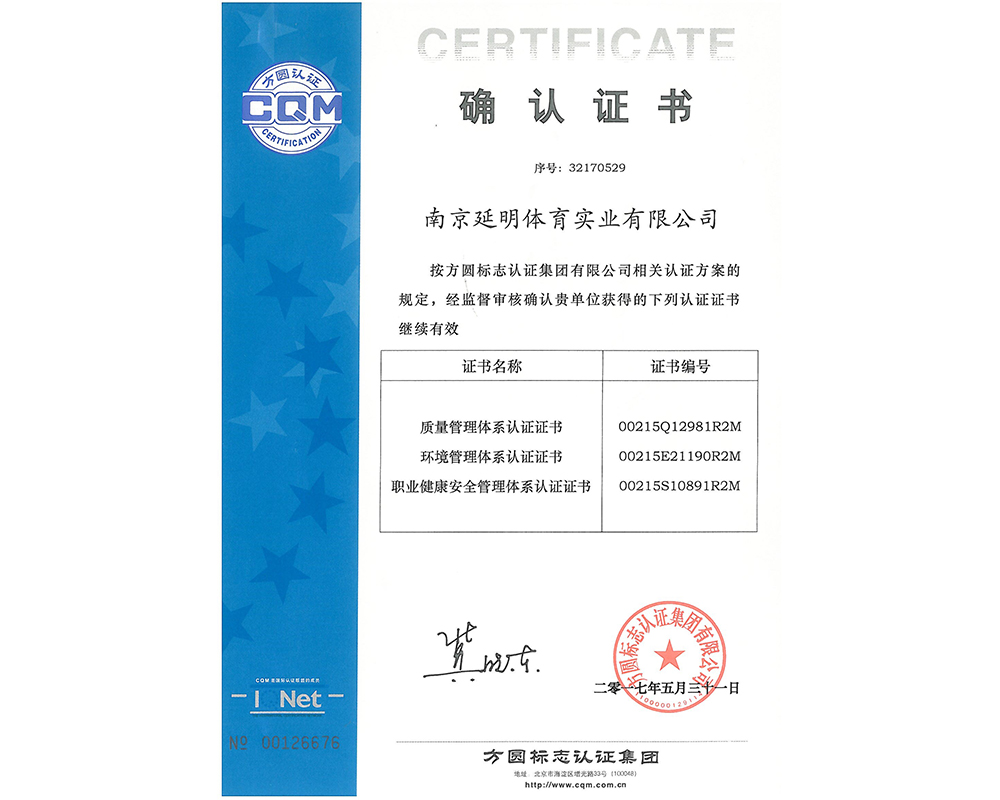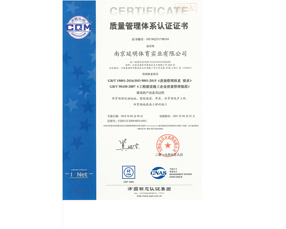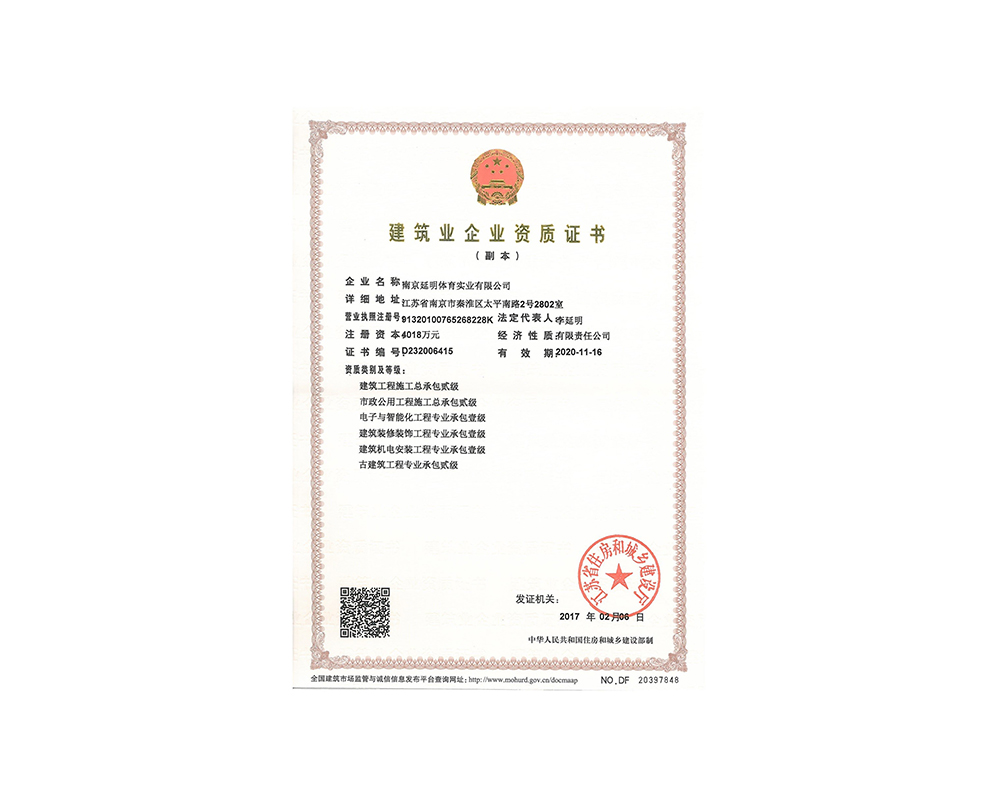 作为江苏省体育产业示范单位,在线买世界杯平台_世界杯(中国)体育拥有多年相关工程总承包施工经验,取得建筑工程施工总承包二级、古建筑工程专业承包二级、建筑装修装饰工程专业承包一级、电子与智能化工程专业承包一级、市政公用工程施工总承包二级资质;通过ISO 9001:2015质量管理体系认证;通过ISO14001:2015环境管理体系认证;通过IOS45001:2018职业健康安全管理体系认证。